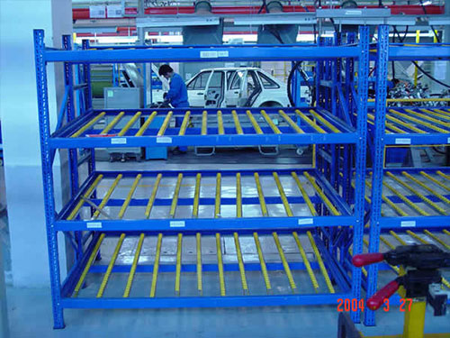 后推式货架是一种高密度托盘储存系统,它是将相同货物的托盘存入二、三和四倍深度又稍微向上倾斜可伸缩的轨道货架上。托盘的存放和取出是在同一通道上进行的,存入时叉车将托盘逐个推入到货架深处,取出时托盘借重力逐个前移,因而最先放入的托盘是在最后取出的。该系统既能达到驶入型货架的仓容量,又能达到托盘自滑动型货架的取出能力。