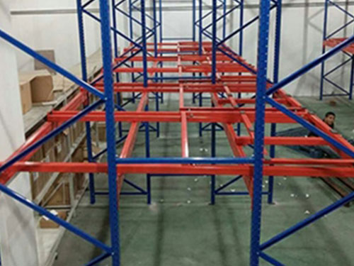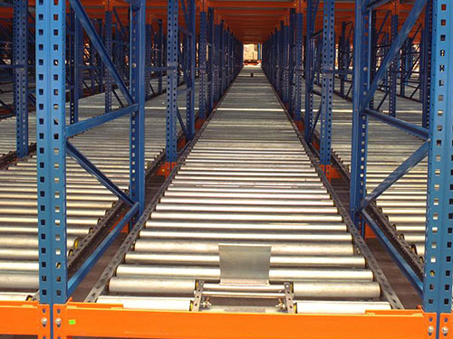 后推式货架是一种高密度托盘储存系统,它是将相同货物的托盘存入二、三和四倍深度又稍微向上倾斜可伸缩的轨道货架上。托盘的存放和取出是在同一通道上进行的,存入时叉车将托盘逐个推入到货架深处,取出时托盘借重力逐个前移,因而最先放入的托盘是在最后取出的。该系统既能达到驶入型货架的仓容量,又能达到托盘自滑动型货