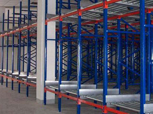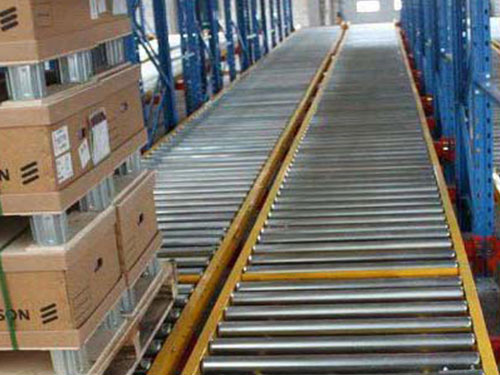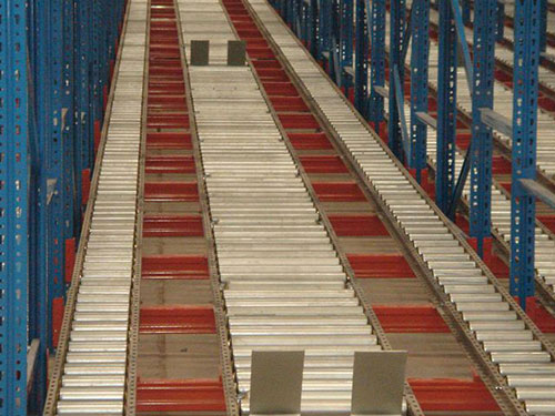 重力式货架又叫辊道式货架,是横梁式货架衍生品之一,货架结构与横梁式货架相似,只是在横梁上安装了滚筒式轨道,轨道呈3-5倾斜。托盘货物用叉车搬运至货架进货口,利用自重,托盘从进口自动滑行至另一端的取货口.